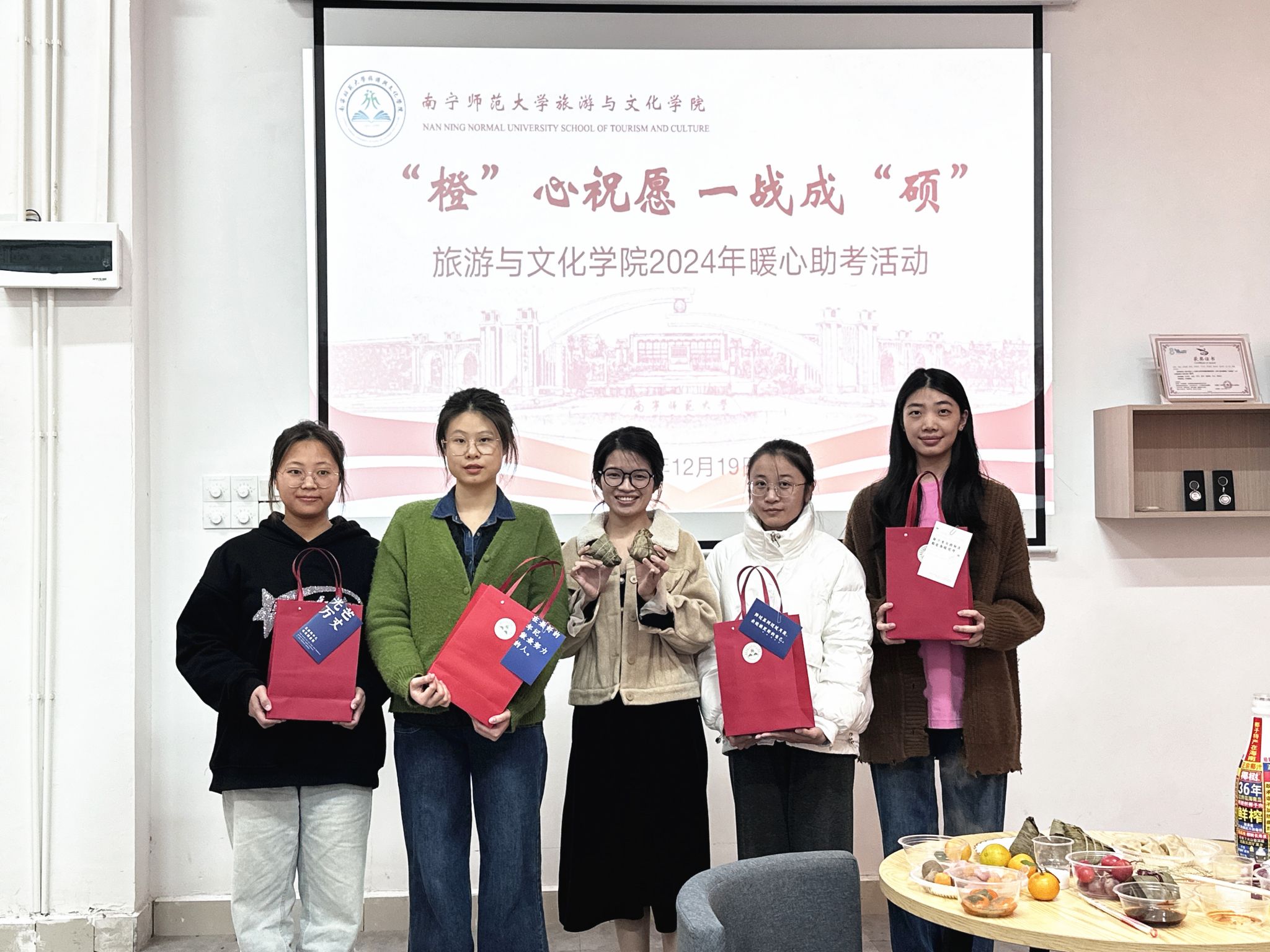 此外精心准备的礼物发放环节更是将活动推向了高潮。学院为考研学子们准备了精心定制的“考研加油包”。在定制的礼物袋中,每一样物品都饱含深意。旺仔寓意着“旺”运当头,希望学子们在考试中能够超常发挥,收获理想的成绩;橙子谐音“成”,代表着“一战成‘硕’”的美好祝愿;暖宝宝在寒冬之际为学子们送去身体上的温暖,也象征着学院始终是他们坚实的后盾,给予心灵的慰藉;可爱的杯子则寓意着一辈子的友情与学院对他们永恒的支持,无论结果如何,他们都永远是学院大家庭中备受珍视的一员;励志卡片上写满了对学子们的鼓励与期许,那些真挚的话语如同一束束光,照亮他们前行的道路。每一份礼物都经过精心挑选和包装,承载着学院师生对考研学子深深的牵挂与祝愿。收到礼物的同学们感动不已,纷纷表示这些礼物不仅实用,更让他们在紧张的备考中感受到了来自学院大家庭的温暖与支持,增强了他们面对考试的信心和勇气。