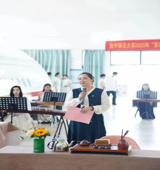 当日,“一叶风华・茶韵三重奏”开幕式在武鸣校区地信楼举行。校团委书记区丽媛、学院党委书记贾坷、顺景茶学院游琦丽老师、茶艺社指导老师陈春容出席活动。贾坷书记致开幕词后,精彩的茶艺表演将现场带入古雅意境。茶员身着传统茶服,依次展示绿茶、红茶、乌龙茶茶艺及宋代点茶技艺,行云流水的冲泡动作与氤氲茶香交织,重现千年茶道之美。古筝演奏与茶服走秀轮番登场,丝弦雅韵与茶人风姿相映成趣,尽显中华传统文化魅力。