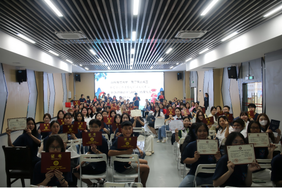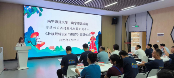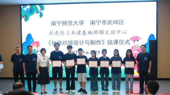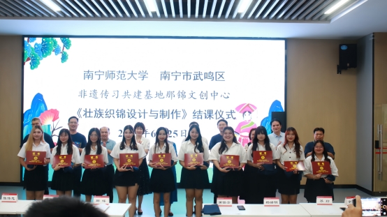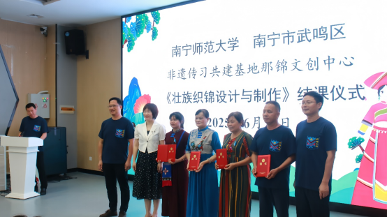 段文军院长主持,泰国籍学生代表谢研华、国内学生代表蒋雨蓓分别从个人学习之后的感受以及未来如何传承等方面做了发言。武鸣壮族服饰市级非遗代表性传承人陆兰珍作为授课教师代表就授课感受、未来授课计划等做了发言。期间与会的领导和嘉宾分别给参课的59名学生发放了武鸣壮族织锦技艺传承证书,并给非遗传承人授予校外传授教师聘书。结课仪式上陆兰珍老师还赠予每一位学生由她和非遗工坊联合设计的具有民族特色纪念的T恤。