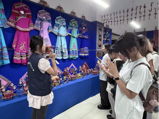 随后,同学们移步至学院壮族非遗工坊,近距离感受传统文化的独特魅力。从传情达意的绣球、祈福纳吉的香囊,到承载婚俗文化的古骆越花轿和蕴含身份象征的壮族传统服饰,志愿者们的细致讲解让静态的展品“活”了起来。同学们饶有兴致地观察、提问,在互动交流中,对壮族文化的精湛技艺与深厚底蕴赞叹不已。