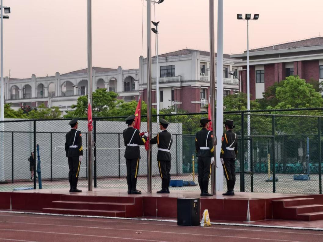 全体学生在松园田径场庄严集结,举行升旗仪式。