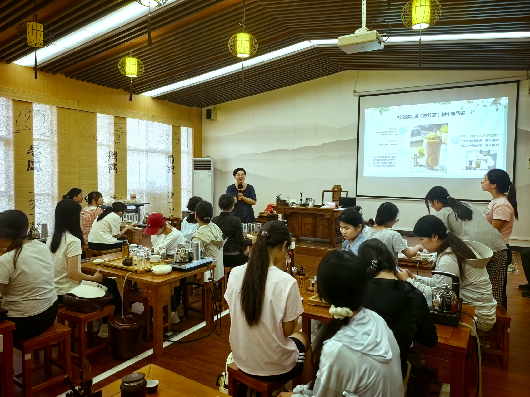 实操环节,杨老师示范正山小种三才碗冲泡技法,纠正冲泡误区;中西茶饮手作环节,师生现场制作港式丝袜奶茶与冻柠茶,感受传统茶文化与现代时尚的融合。