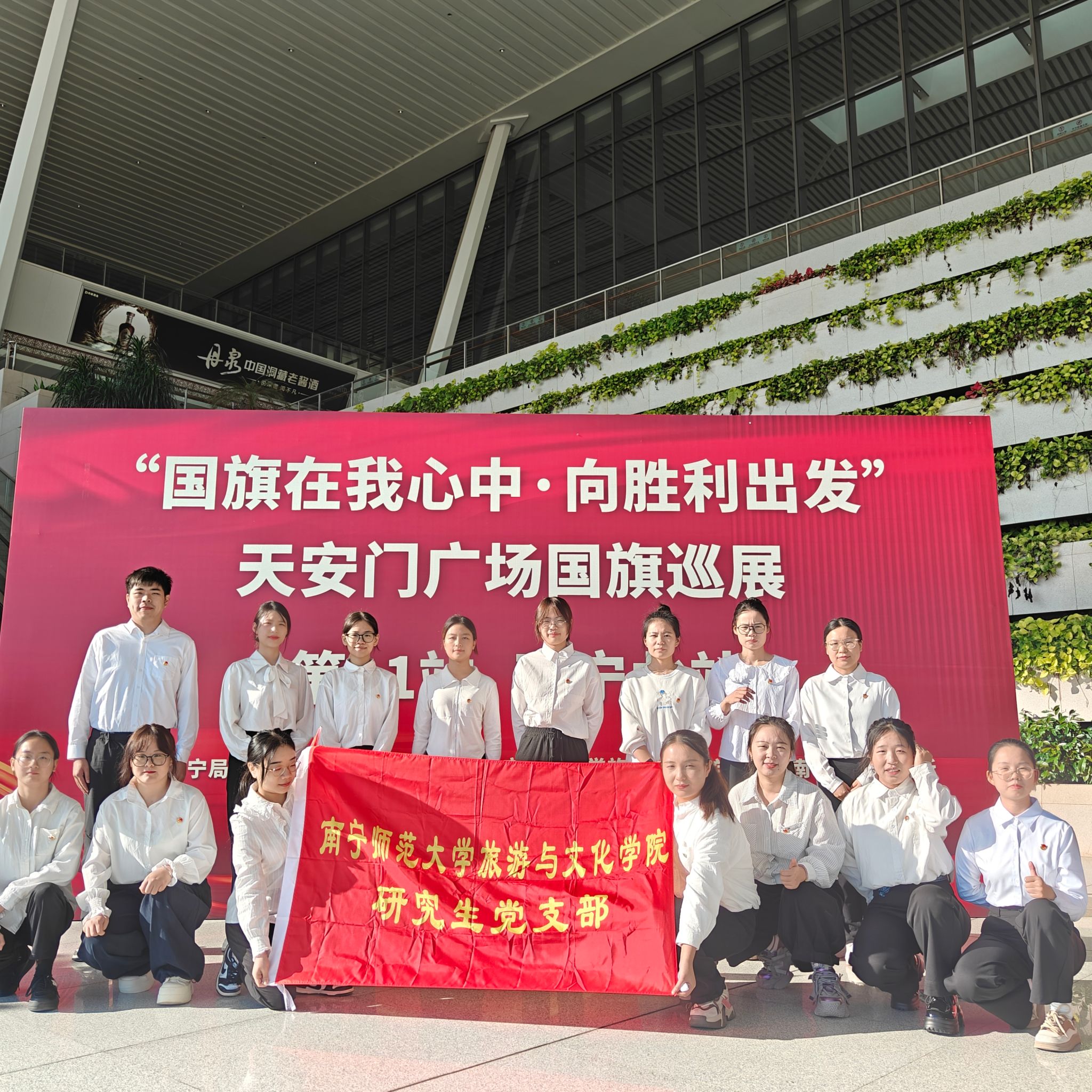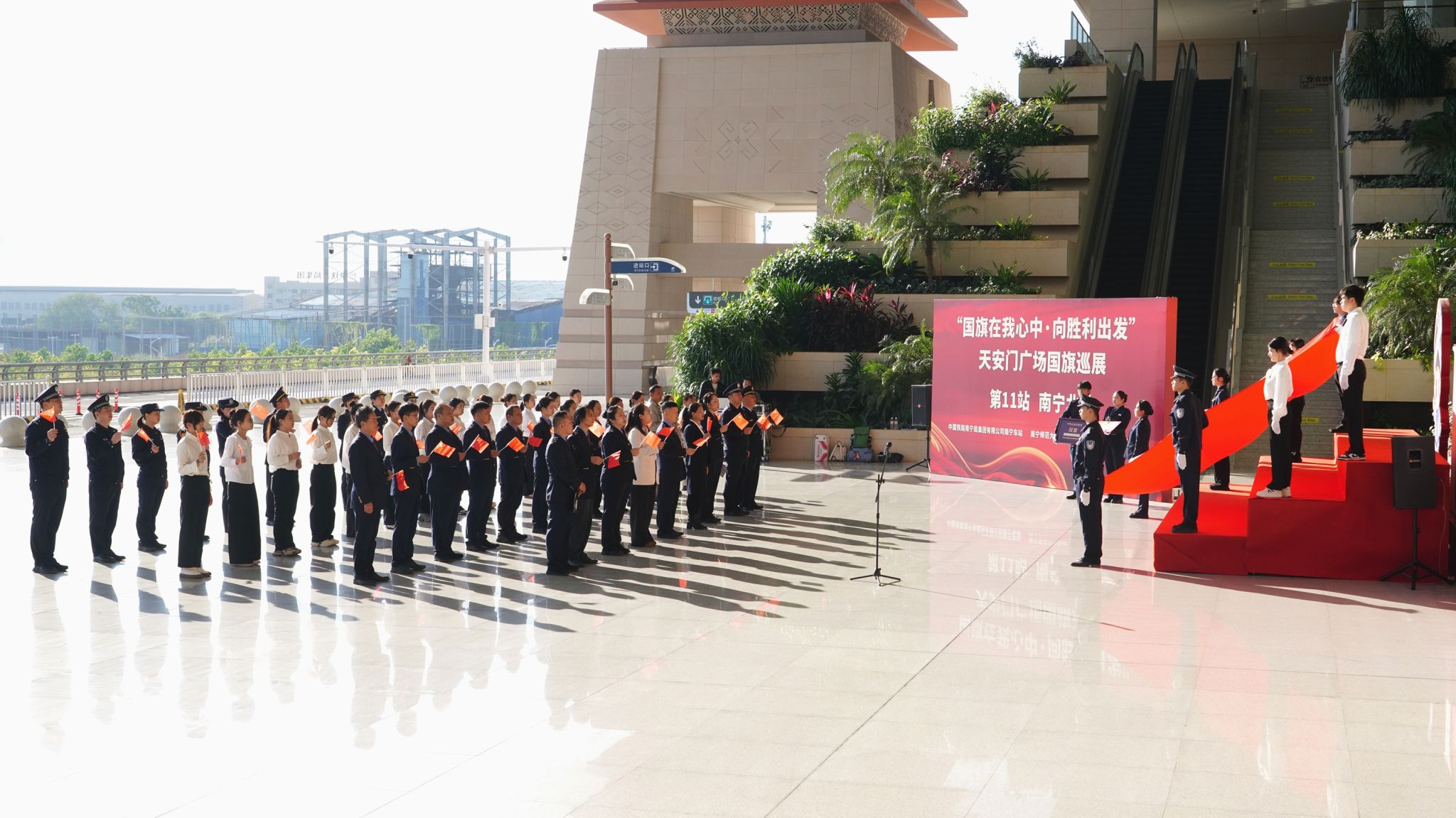 党委副书记黄珍、研究生党支部书记陈春容带领支部成员,赴南宁北站落客平台,与南宁车站、南宁北站派出所等党建联盟单位共同参与“国旗在我心中——向胜利出发”天安门广场国旗巡展第11站(南宁北站)爱国主义教育活动,在庄重仪式与深度互动中传承红色基因,凝聚旅文学子奋进力量。