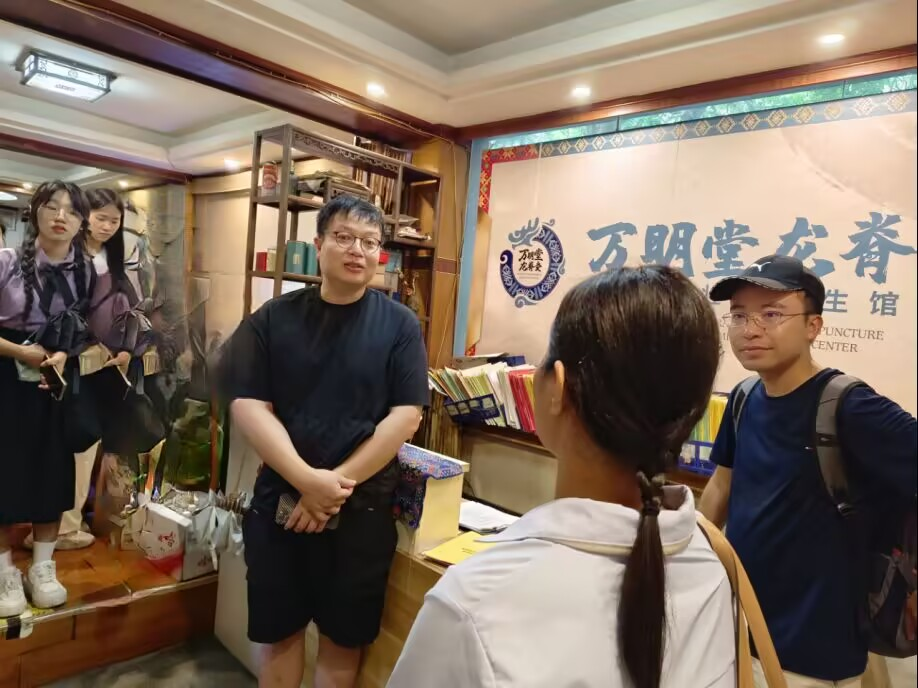 “青数解码・文脉永续” 实践团的大学生志愿者们,怀着对未知的好奇与对传统文化的敬仰,轻轻推开了这座藏着壮医智慧的养生馆大门。在这里,他们与滕氏龙脊灸非遗技艺不期而遇,通过访谈交流、手法观摩、实践体验,开启了一场解码 “医道同源” 生命哲学的奇妙探索之旅。