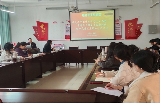 院长段文军主讲,会议由研究生党支部书记陈春容主持,支部全体成员参加了此次党课学习。